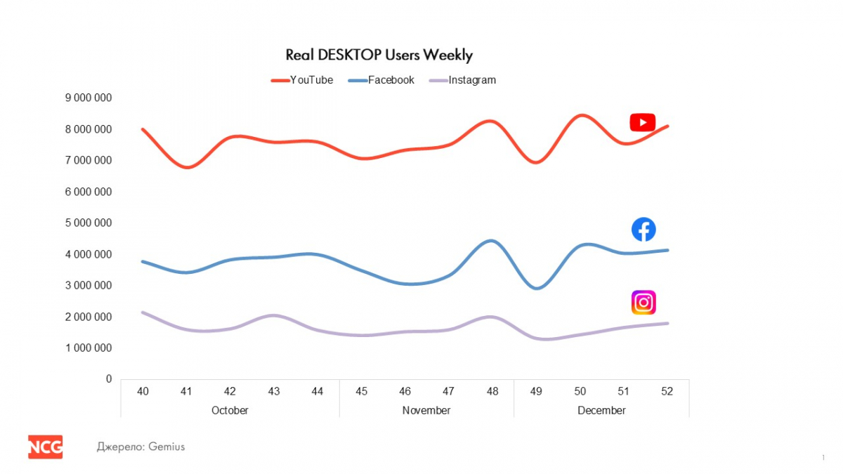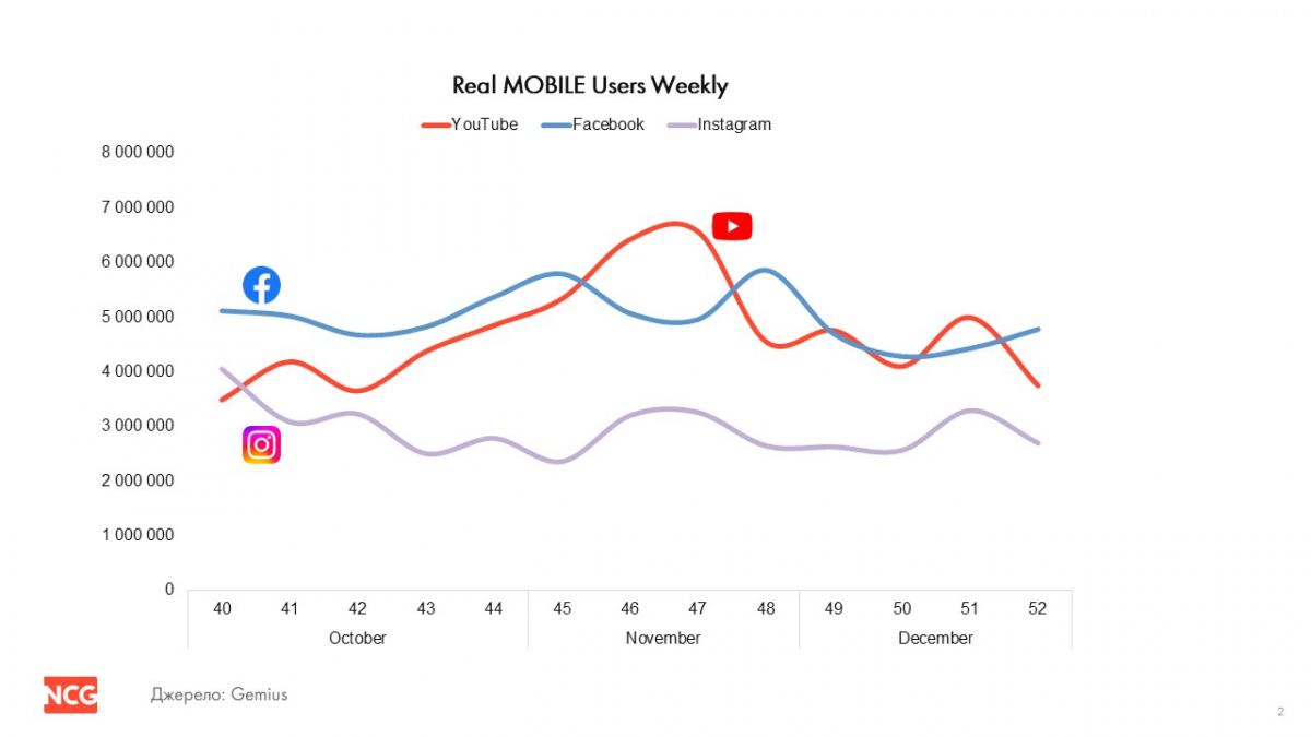 Наприклад, за інформацією Gemius, яку проаналізувала NCG, охоплення ютубу на мобільному протягом грудня коливалося в межах 3,7—4,9 млн користувачів щотижня. Найбільш показовим є 51-й тиждень, коли на фоні складнощів з десктопним доступом мобільне охоплення зросло до свого піку — майже 5 млн контактів. Це підтверджує, що смартфон є «резервним екраном», який рятує кампанії від просідання.